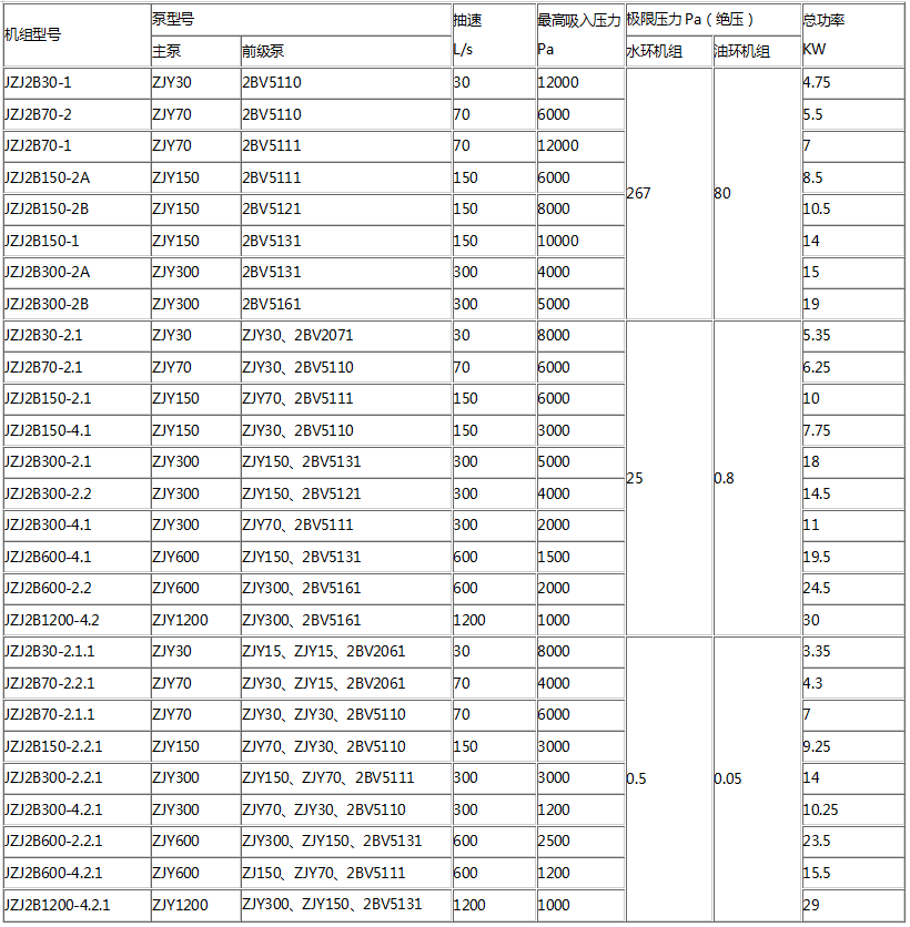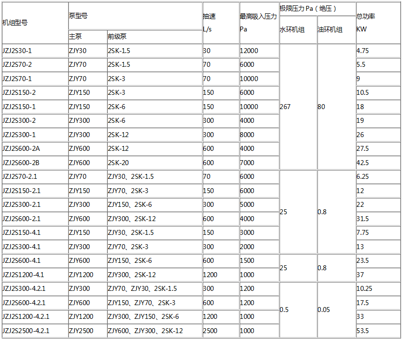 5、根據(jù)實(shí)際工況條件選用合適的機(jī)組配置。例如:JZJ2B300-4.1機(jī)組及JZJ2B300-2.1機(jī)組的最大抽氣速率及極限壓力都是相同的,所不同的是它們的工作范圍及消耗的功率不同,JZJ2B300-4.1機(jī)組正常工作范圍為2000Pa~125Pa,而JZJ2B300-2.1機(jī)組的正常工作范圍為5000Pa~125Pa,很明顯JZJ2B300-2.1機(jī)組的正常工作范圍更寬,但其所消耗的功率也更大。如果能確認(rèn)被抽系統(tǒng)的工作壓力<2000Pa時(shí),應(yīng)優(yōu)先選用JZJ2B300-4.1機(jī)組以節(jié)約能源。如果要求機(jī)組對(duì)系統(tǒng)有較強(qiáng)的預(yù)抽能力且機(jī)組需較長(zhǎng)時(shí)間工作在較高壓力時(shí),則選用具有更大的前級(jí)泵的JZJ2B300-2.1機(jī)組更為合適。