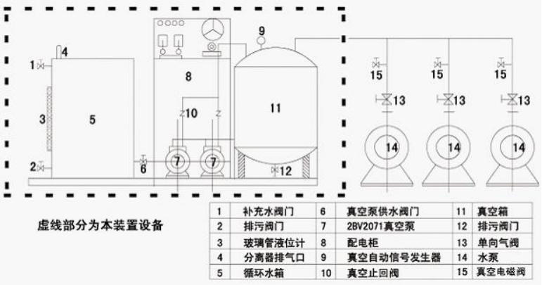 ZKYS真空引水裝置由兩臺(tái)2BV7111水環(huán)真空泵,一個(gè)真空罐,一個(gè)循環(huán)供水罐,一組管道閥件及一套電氣自動(dòng)控制配電箱組成的成套的真空機(jī)組,是以真空罐作為真空存儲(chǔ)設(shè)備的成套系統(tǒng)。泵站內(nèi)所有水泵頂部排氣口均安裝一個(gè)單向氣閥(不在本裝置范圍之內(nèi),需要可另行訂貨),并用管道與真空罐相連。單向氣閥的作用是使?jié)B入水泵內(nèi)空氣可自由進(jìn)入真空箱,而水不能通過止回閥。離心泵的開停由中央控制器通過真空管線上各自的電磁閥和流量開關(guān)控制。電磁閥處于常閉狀態(tài),當(dāng)中央控制器需要啟動(dòng)離心泵時(shí),首先打開電磁閥讓離心泵與真空管線想通,當(dāng)水流過流量開關(guān)時(shí)說明離心泵處于可啟動(dòng)狀態(tài),中央控制器關(guān)閉電磁閥并同時(shí)啟動(dòng)離心泵。真空箱上裝有自動(dòng)信號(hào)發(fā)生器,真空設(shè)備根據(jù)其指令自動(dòng)工作。當(dāng)真空箱內(nèi)真空度低于下限時(shí),發(fā)出停止指令真空設(shè)備自動(dòng)停止。因工作液可循環(huán)使用,系統(tǒng)大大減小了工作液的消耗和對環(huán)境的污染,因此在所抽除氣體中有毒,所抽除氣體含有有機(jī)溶劑等各種場合具有明顯優(yōu)越性。在本裝置中工作液采用水作為介質(zhì)。